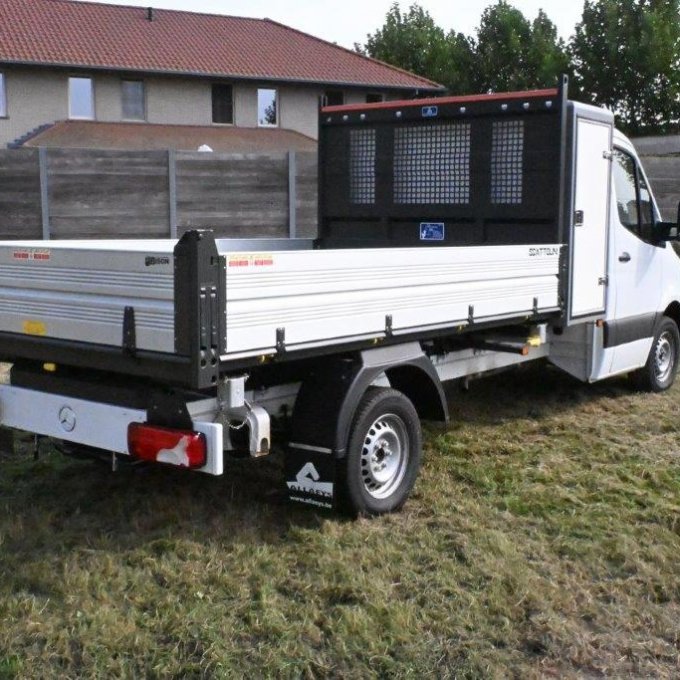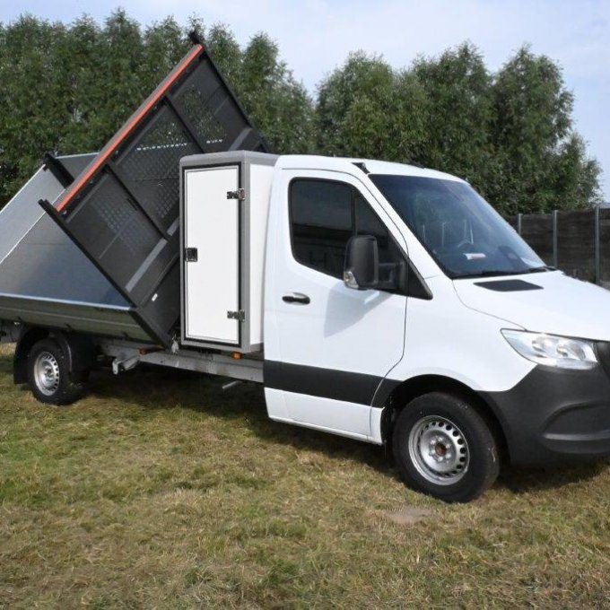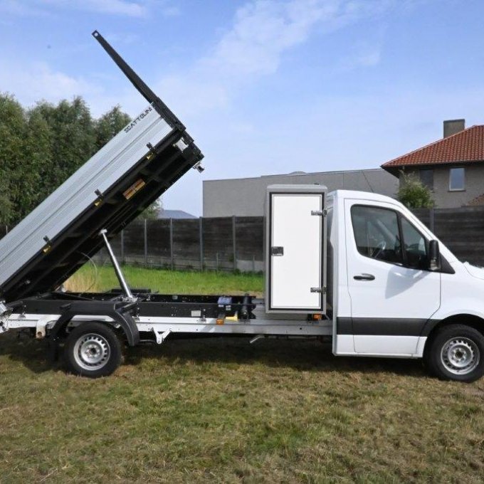 MB Sprinter équipé d'une benne basculante 3 côtés Scattolini et d'un coffre intermédiaire avec portes.